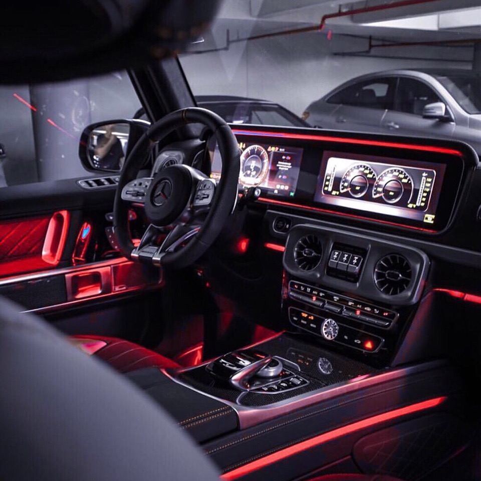 Выхлопная труба на G 63 AMG с двойным раструбом находится с двух боков гелика перед задним колесом. Передняя оптика с круговыми диодными лентами и функцией «умный свет». Повторители поворотов установленными в виде аутентичных квадратных фонарей спереди на капоте. Боковые зеркала Mercedes AMG G 63 обтекаемой формы (у предыдущей модели квадратные).