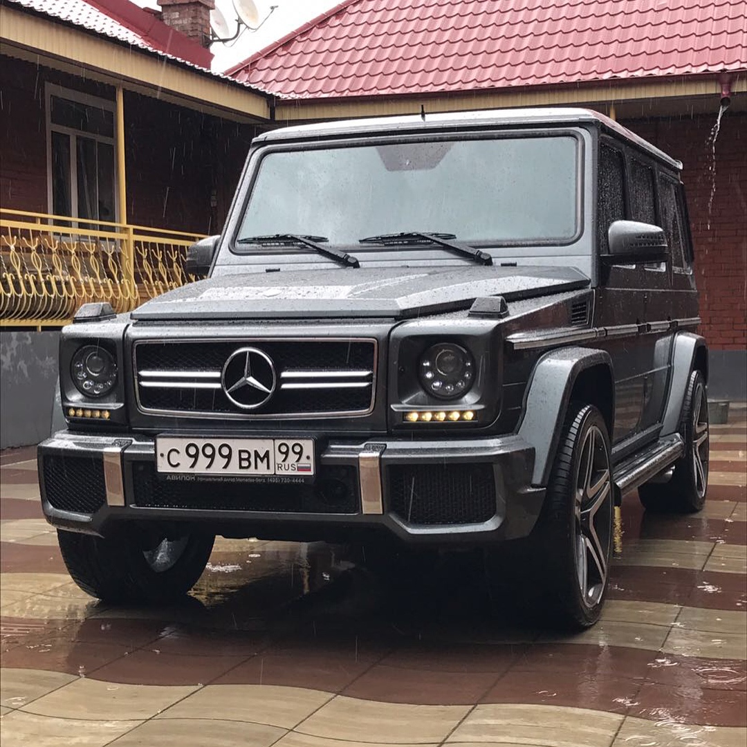 На G63 установлена зубчатая решетка радиатора, покрытая хромом, посредине фирменный значок Мерседес. Спортивный бампер отличается от обычного Г500. В широких колесных арках установлены большие колеса с дисками диаметром 22 дм.